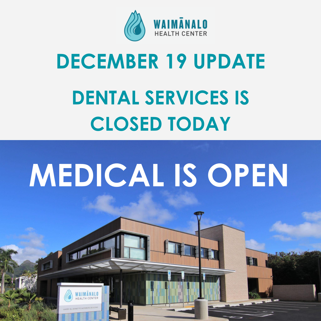 UPDATE 12/19/2022, 11:20AM: Due to the power outage, Waimānalo Health Center Dental Services will be closed the remainder of today. We apologize for the inconvenience. For patients with appointments, our staff will be reaching out to you to reschedule your appointment.